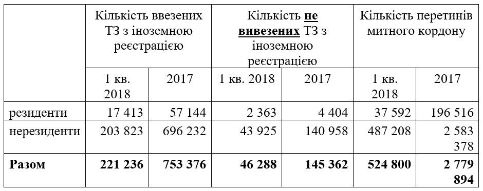 По состоянию на 1 мая 2018 г., 315 тысяч автомобилей, завезенных по транзитной и временной схеме, до сих пор не покинули территорию нашей страны, из них 125 тысяч – нарушили установленные сроки. А всего с 1 января 2016 года на территорию Украины въехало более 2 млн транспортных средств по указанным выше правилам. Кстати, полис страхования был приобретен лишь 198 тысячами их собственников (на 1 мая 2018 г. по данным Моторного страхового бюро). По информации полиции, в прошлом году было совершено 10 тысяч ДТП с участием автомобилей с иностранной регистрацией, или 9% от общего числа.