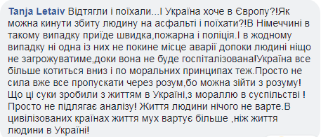 "Оттащили и поехали. И Украина хочет в Европу?! Как можно бросить збитого человека на асфальте и поехать?! В Германии в таком случае приедет скорая, пожарная и полиция. И в одном случае ни одна из них не покинет место аварии пока человеку ничто не будет угрожать, пока он не будет госпитализирован… Жизнь человека ничего не стоит. В цивилизованных странах жизни мух стоят больше, чем жизнь человека в Украине", – возмутились в комментариях.