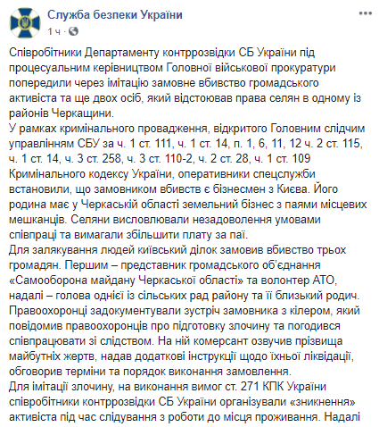 Как сообщает в среду пресс-центр СБУ на странице в соцсети Facebook, оперативники спецслужбы установили, что заказчиком убийств является бизнесмен из Киева, семья которого имеет в Черкасской области земельный бизнес с паями местных жителей.