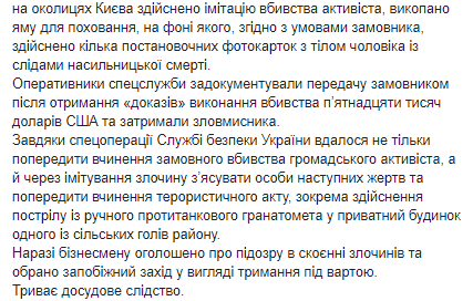 "Благодаря спецоперации Службе безопасности Украины удалось не только предупредить совершение заказного убийства общественного активиста, но и через имитирование преступления выяснить личности следующих жертв и предупредить совершение террористического акта, в частности выстрела из ручного противотанкового гранатомета в частный дом одного из сельских голов района", – сказано в сообщении.