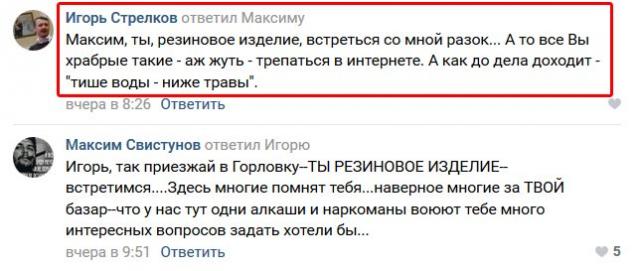 Так, Гиркин начал оскорблять жителя оккупированной Горловки за боевые действия на Донбассе на что тот ответил: «Игорь, так приезжай в Горловку -- ТЫ РЕЗИНОВОЕ ИЗДЕЛИЕ -- встретимся… Здесь многие помнят тебя… наверное многие за ТВОЙ базар -- что у нас тут одни алкаши и наркоманы воюют тебе много интересных вопросов задать хотели бы… (стиль автора сохранен)».