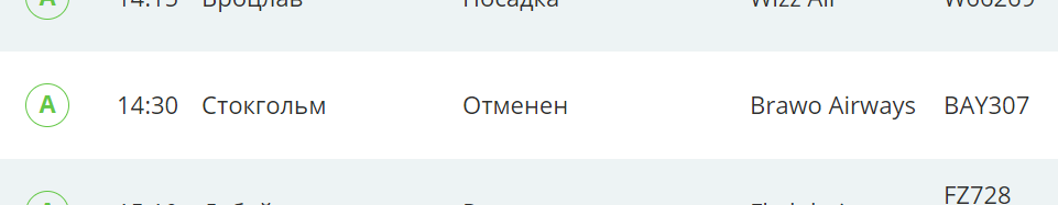 Рейс BAY307 в Стокгольм Bravo Airways в 14:30 также отменили. На сайте авиакомпании опубликовано обновленное расписание, где об этом рейсе информации нет.