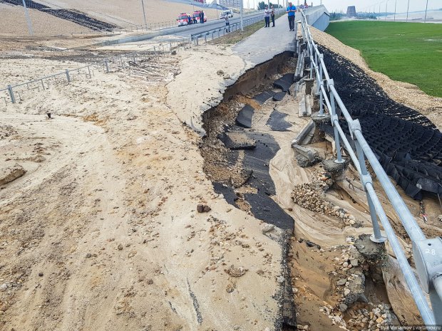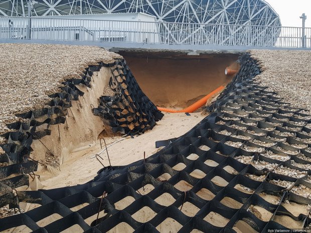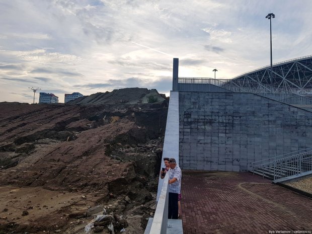 "Сейчас вам начнут рассказывать, что это чрезвычайная ситуация, так бывает. Но в нескольких сотнях метров от стадиона в Волгограде воздвигнут мемориальный комплекс Мамаев Курган, и его десятки лет не смывает", – рассказал Илья Варламов, который и сделал фото стадиона.