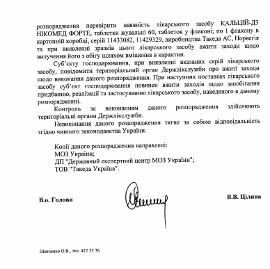 Так, запретили препарат серии 11429329, 11433082 — "Кальций-Д3 Никомед Форте" в жевательных таблетках по 60 штук во флаконе, по одному флакону в картонной коробке производства Такеда АС, Норвегия.