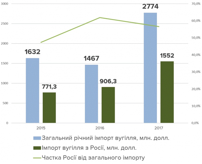 Импорт угля в 2017 году вырос вдвое по сравнению с 2016 годом, при этом 56% объема поступило из России. В 2017 году в денежном выражении импорт угля из РФ составил 1,552 млрд долл. Если Россия снова остановит поставки угля, как это было в 2015 году, может возникнуть дефицит этого топлива зимой.