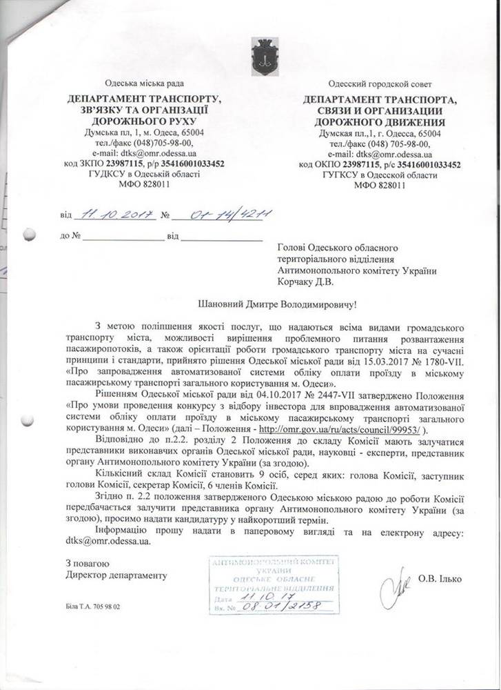 Уже в феврале следующего года после многочисленных публикаций СМИ, Одесское отделение АМКУ «проснулось» и усмотрело нарушения в проведении конкурсного отбора в части экономической конкуренции. Речь идет об обязательном наличии сервисного центра для участников конкурса, что снизило количество претендентов до одного. Чиновники направили в мэрию соответствующее письмо с рекомендацией провести его повторно. Их обязывали в течение трех месяцев устранить нарушения.