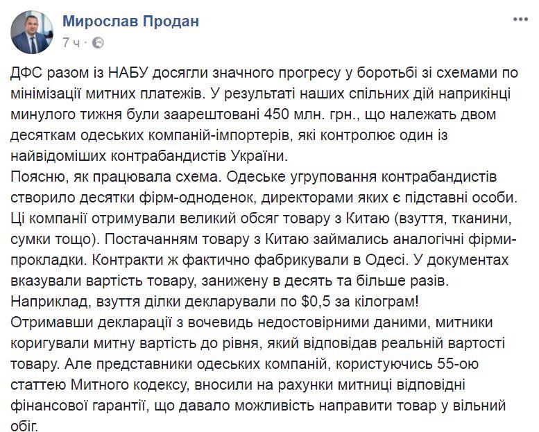 Об этом 1 октября 2017 года написал на своей странице в Фейсбуке исполняющий обязанности главы ДФСУ Мирослав Продан.