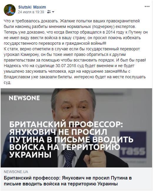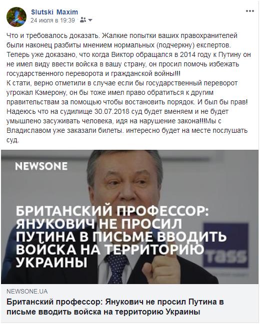 “Теперь уже доказано, что когда Виктор обращался в 2014 г. к Путину он не имел ввиду ввести войска, он просил помочь избежать государственного переворота и гражданской войны” сообщает Владислав Израилит (Vladislav Seev Izrailit), который входит в близкое окружение беглого Президента Януковича.