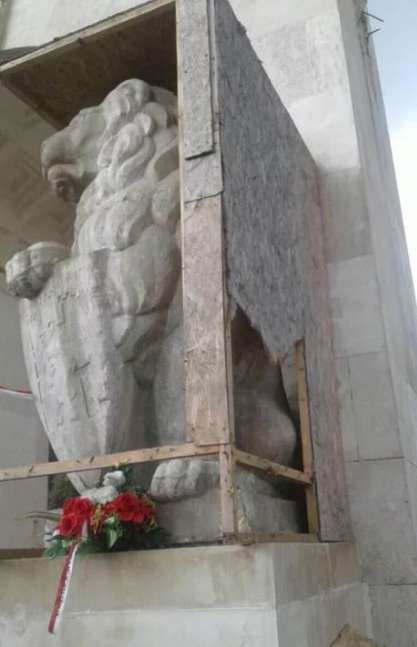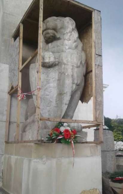 Сообщается, что в 16:30 девять молодых людей спортивного телосложения начали разбирать реставрационные щиты, которые закрывали скульптуры двух львов возле входа к польским военным захоронениям.