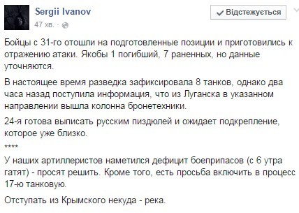 "У наших артиллеристов наметился дефицит боеприпасов (с 6 утра гатят) - просят решить. Кроме того, есть просьба включить в процесс 17-ю танковую. Отступать из Крымского некуда - река", - сообщил он.