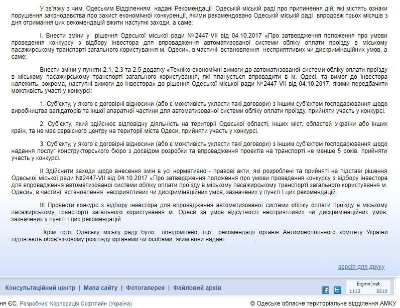 Спустя четыре месяца после письма – в феврале Корчак направил мэрии рекомендацию, в которой указал на «грубые» нарушения антимонопольного права, настаивая на необходимости внести изменения в решение горсовета и провести новый конкурс.
