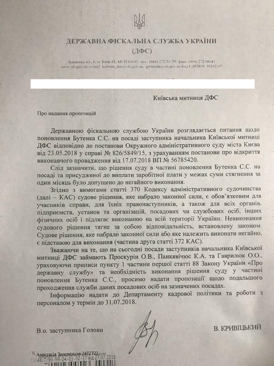 Так, в письме руководству Киевской таможни Кривицкий просит исполнить решение суда о восстановлении в правах бывшего замглавы столичной таможни Сергея Бутенко: