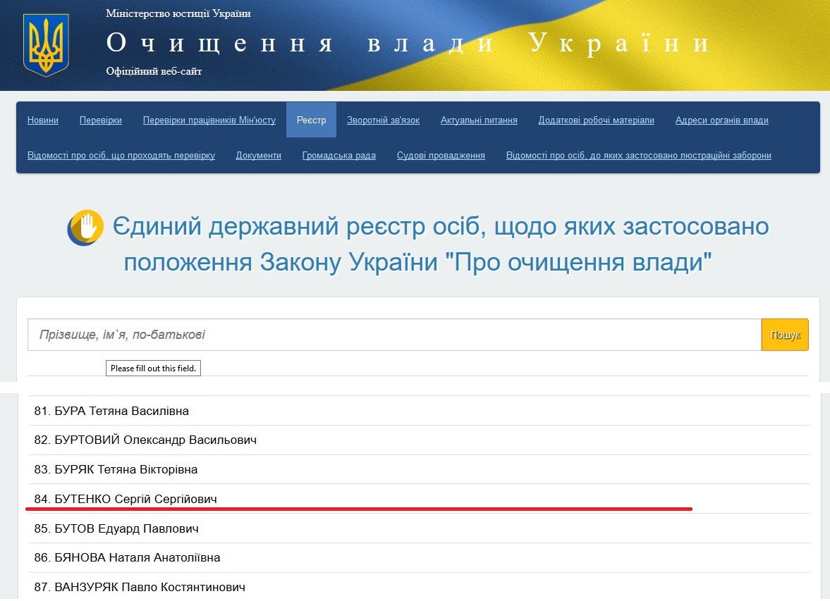 Сергей Бутенко, о котором идет речь, занимал свою должность до начала процесса люстрации. В официальном реестре граждан, по отношению к которым был применен закон «Об очищении власти», он занимает 84 позицию: