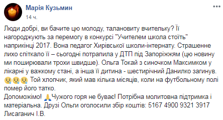 В смертельном ДТП в Запорожской области пострадала преподавательница школы-интерната из города Хыров (Львовская область) Ольга Токай, сообщает на своей странице в Facebook журналистка Мария Кузьмин.