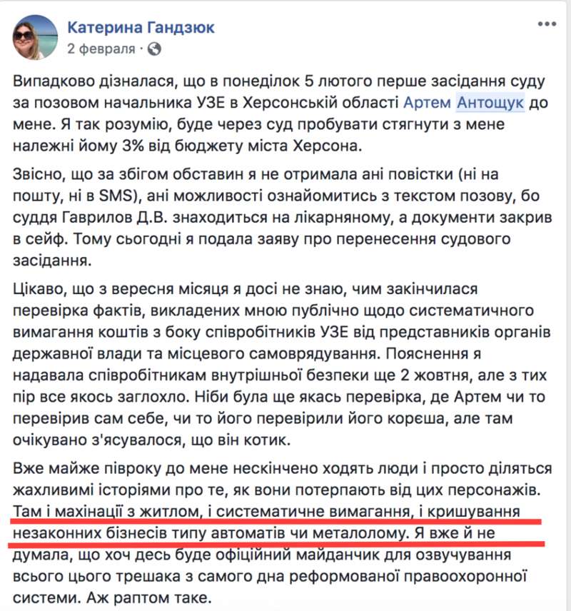 У Катерины Гандзюк давний конфликт с начальником управления защиты экономики в Херсонской области Артемом Антощуком. Гандзюк открыто обвиняла его в коррупции. В ответ Антощук подал в суд и потребовал опровержения обвинений, но суд не обязал Гандзюк опровергнуть сказанное.