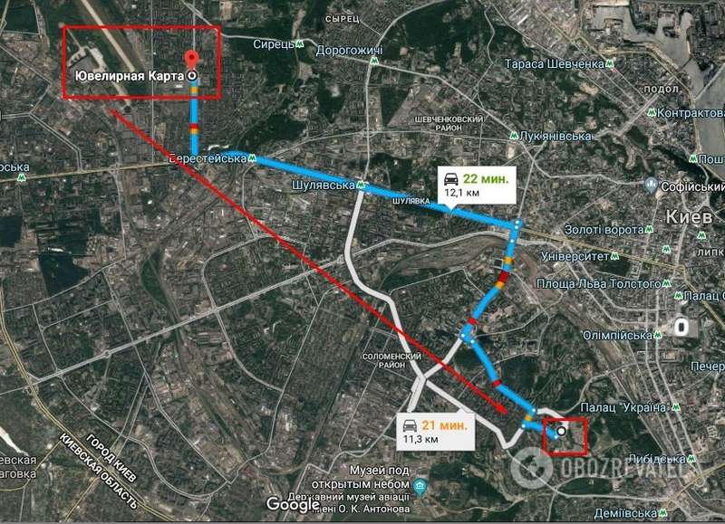 От места налета до гаражного кооператива "Батыевский" преступники проехали более десяти километров в направлении центра Киева. НЕ из города, как можно было бы предположить. В полиции заявляли, что был объявлен план "Перехват", однако задержать преступников не удалось.