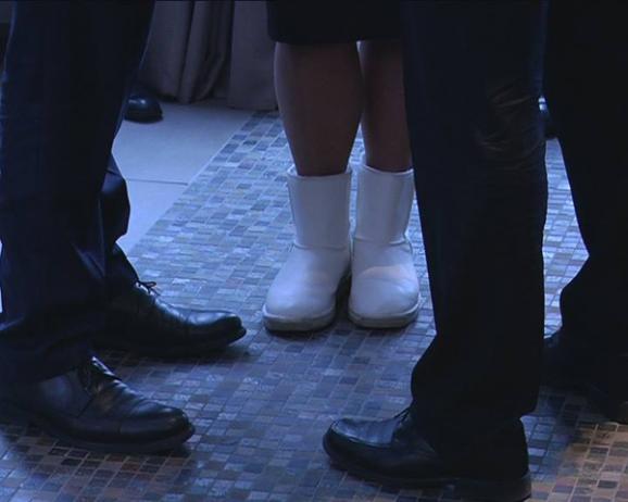 Діловий костюм глава Нацбанку доповнила білими і при цьому не ідеально чистими уггі.
