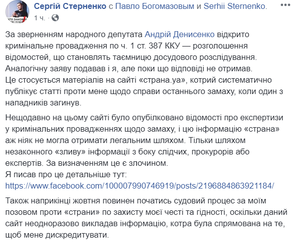 "Эту информацию "Страна" отнюдь не могла получить легальным путем. Только путем незаконного "слива" информации со стороны следователей, прокуроров или экспертов. По определению это является преступлением", - написал Стерненко у себя в Facebook.
