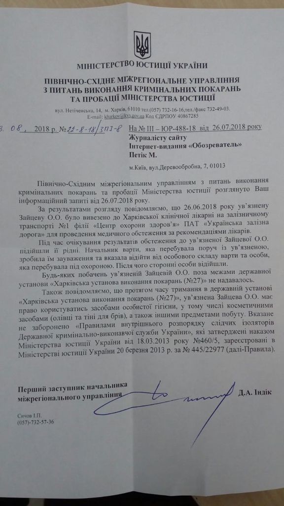 "Во время ожидания результатов обследования к арестованной Зайцевой подошли ее родственники. Начальник охраны, которая находилась рядом с арестованной, сделала им замечание и попросила отойти от личного состава охраны и персоны, которая находится под охраной. После этого они отошли. Каких-либо свиданий с арестованной Зайцевой вне границ СИЗО не было", - говорится в официальном ответе OBOZREVATEL.