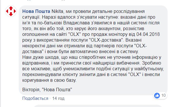 Позднее в «Новой почте» уточнили, что некорректные данные были автоматически внесены в систему, после того, как пользователь сам внес их при размещении объявления на «OLX».