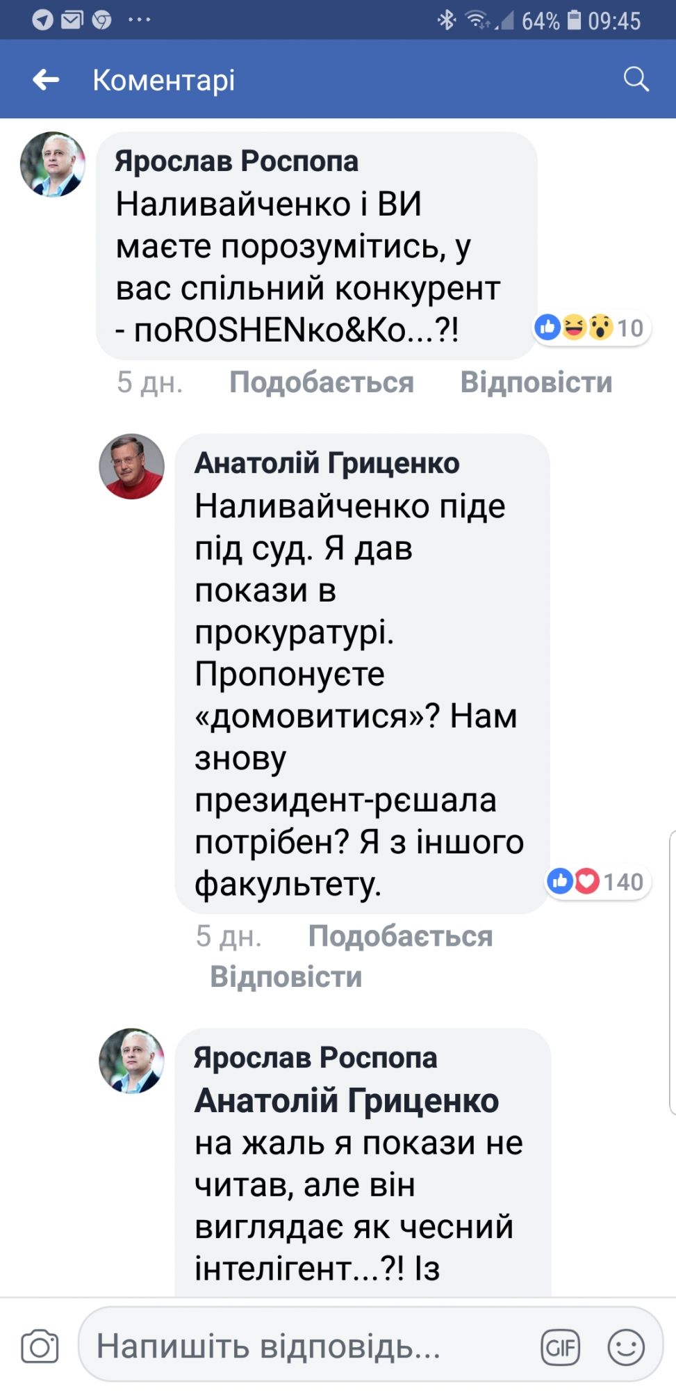 Также в комментариях к собственному посту в социальной сети Facebook, экс-министр обороны Украины Анатолий Гриценко заявил, что Наливайченко пойдет под суд, потому что Гриценко уже дал показания в прокуратуре.