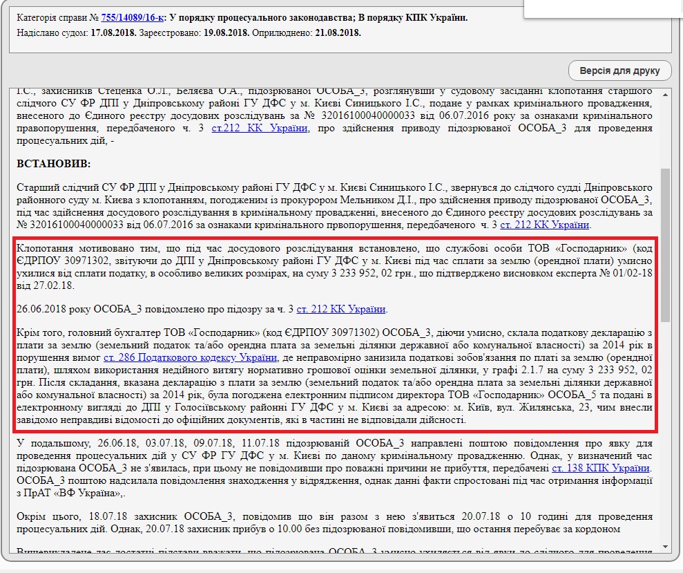 26 июня 2018 года бухгалтеру ООО “Господарник” было сообщено о подозрении по ч. 3 ст. 212 УК Украины. В дальнейшем (26 июля 2018 года, 3 июля 2018 года, 9 июля 2018 года и 11 июля 2018 года) ей по почте направлялись извещения о необходимости явки в ГФС Киева для проведения процессуальных действий по уголовному производству. Однако, в определенное время подозреваемая не явилась, не сообщив об уважительных причинах. По почте она посылала сообщения о нахождении в командировке, однако данные факты были опровергнуты информацией, полученной следствием у ЧАО “ВФ “Украины” (“Водафон”).