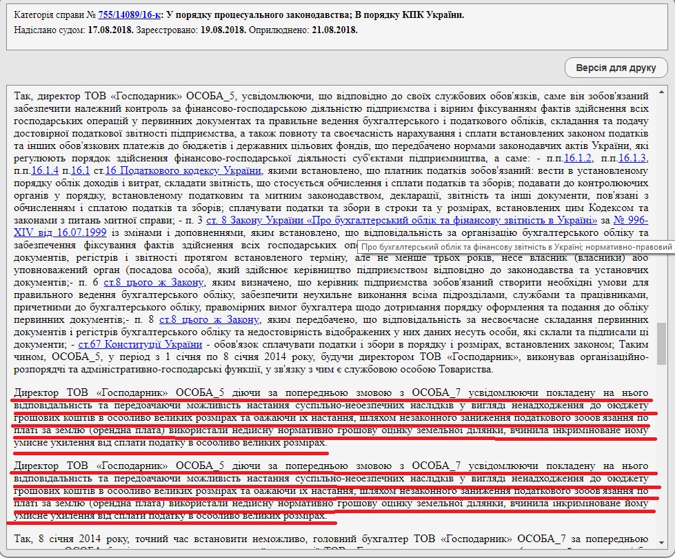 Следствие выяснило, что главный бухгалтер ООО “Господарник” составила налоговую декларацию по уплате за землю за 2014 год с нарушением требований ст. 286 Налогового кодекса Украины, чем неправомерно занизила налоговые обязательства по уплате путем использования недействительной нормативно-денежной оценки земельного участка. При этом, указанная декларация по плате за землю была согласована электронной подписью директора ООО “Господарник” и представлена в электронном виде в ГНИ в Голосеевском районе.