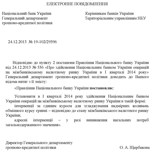 Так, постановлением №536 от 24 декабря 2013 года "Об осуществлении НБУ операций на межбанковском валютном рынке Украины в первом квартале 2014 года" Нацбанк разрешил себе проводить "адресные" интервенции "в случае возникновения насущной необходимости общегосударственного значения".