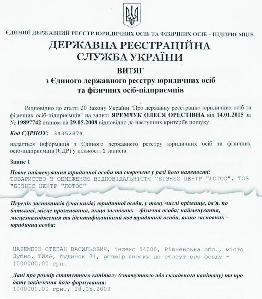 Як нам вдалося дізнатися, ТОВ “Бізнес центр “Лотос” засноване 03.07.2006 року. Зробив це не відомий широкій громадськості громадянин Литвиненко Володимир Іванович. Його внесок до статутного фонду становив 300 тисяч гривень. А от подальша історія цього центру вже цікавіша. За даними Державної реєстраційної служби України, які ми офіційно отримали, уже станом на 29.05.2008 року серед засновників (учасників юридичної особи) — Нарембік Степан Васильович. Розмір статутного фонду зріс до 1 мільйона гривень.