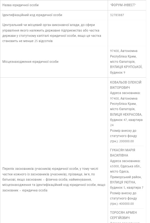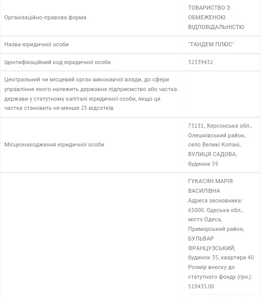 Таинственная Мария Гукасян является совладелицей задекларированного семейного бизнеса — ООО «Тандем плюс» со взносом в уставной фонд в 519,4 тыс. гривен.Особо пикантно, что женщина ведет бизнес на временно оккупированной территории Крыма.