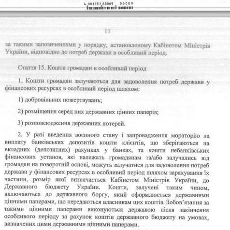 Згідно з цим законопроектом, у випадку введення воєнного стану і запровадження мораторію на виплату банківських депозитів, кошти клієнтів банків, покладені на депозитні рахунки, можуть перейти в держбюджет. До того ж, частка, яку забиратиме держава, встановлюватиметься самим Кабінетом Міністрів.