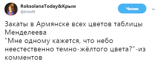 "Закаты в Армянске всех цветов таблицы Менделеева. "Мне одному кажется, что небо неестественно темно-жёлтого цвета?""- цитирует одного из комментаторов соцсети блогер.