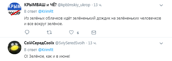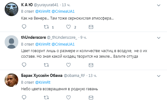 "Из зелёных облачков идёт зелёненький дождик на зелёненьких человечков и все вокруг зелёное", "Как на Венере... Там тоже сернокислая атмосфера...", "Цвет говорит лишь о размере и количестве частиц в воздухе, не о их составе. Но зная какой *издец творится на земле... Валите оттуда", - пишут комментаторы.