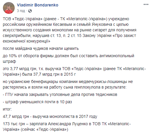 Он напомнил, что после Евромайдана компанией "Тедис-Украина", основанной российским оружейником Игорем Кесаевым и семьей украинского экс-президента Виктора Януковича с целью искусственного создания монополии на рынке сигарет для получения сверхприбыли, заинтересовалпсь прокуратура.
