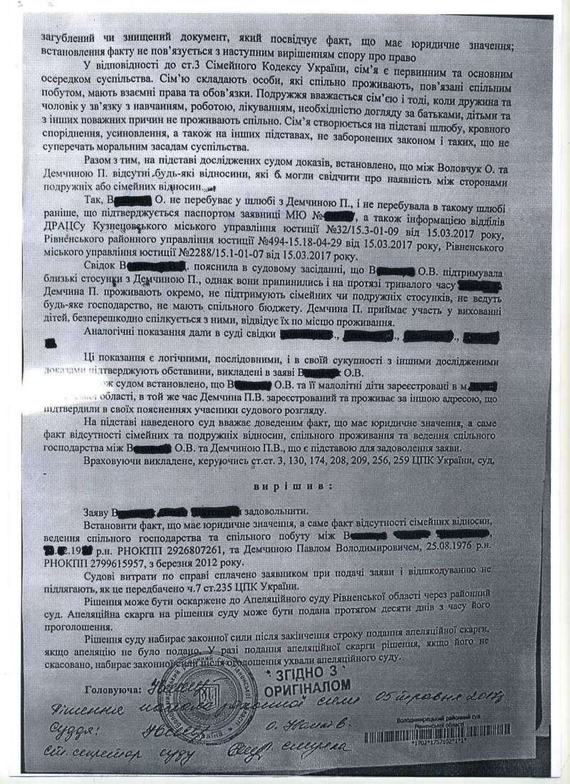 “на підставі досліджених судом доказів, встановлено, що між Воловчук О. та Демчиною П. відсутні будь-які відносини, які б могли б свідчити про наявність між сторонами подружніх чи сімейних відносин”.