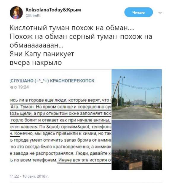 По их словам, от кислотного тумана у людей текут слезы и сопли, горло болит и отекает как при начале ангины, болит и кружится голова, появляется кашель. По горячим телефонам отвечают, что это обычный туман. «Конечно мы здесь привыкли к химии, но такого раньше не было. Каждый житель города умеет отличить запах брома от аммиака и сероводорода, но это всегда было кратковременно, а аммиак и сероводород дальше завода не распространялся. Люди давайте хоть что-то делать, звонить по всем телефонам. Иначе вся эта история очень плачевно закончится», — паникуют местные жители. «Кислотный туман похож на обман…. Похож на обман серный туман-похож на обмаааааааан… Яни Капу паникует, вчера накрыло», — написала RoksolanaToday&Крым.