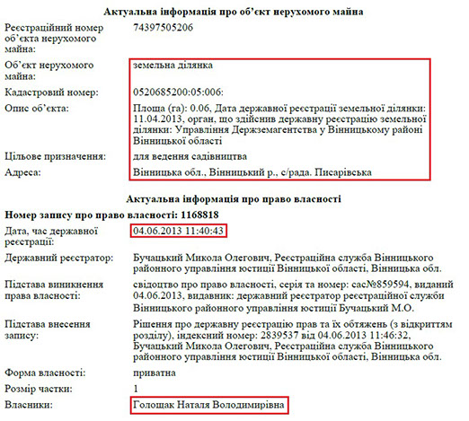 У 2014 році Віталій Голощак став власником земельної ділянки с. Лука-Мелешківська, що під Вінницею. Її площа – 518 кв. м. У 2017 році Наталя Голощак теж придбала паркомісце у будинку на Французькому бульварі, 22/3. Обійшлося воно їй у 160 тис. грн.