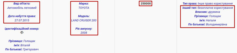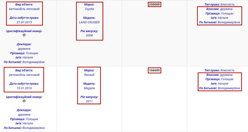 Окрім елітного нерухомого майна, у власності родини прокурора доволі дорогі автомобілі. Наталя Голощак протягом 2015-2016 років стала власницею 2 автомобілів: Toyota Land Cruiser 2008 рокувартістю 250 тис. грн та Renault Megane 2011 року вартістю 166 тис. грн. Натомість Віталій Голощак лише користується Toyota Land Cruiser.