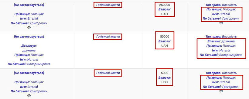 Витрачаючи великі кошти на придбання рухомого та нерухомого майна, родині вдалося навіть заощадити. Віталій Голощак є власником 250 тис. грн готівки. Його дружина, пані Наталя, заощадила 50 тис. грн та 5 тис. доларів.