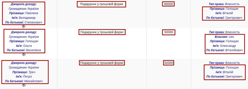 Більшу частину подарунків родина прокурора задекларувала від батьків Наталії Володимирівни Голощак (дівоче прізвище – Павлина). За нашою інформацією, Галина Миколаївна Павлина та Володимир Степанович Павлина працювали у Крижопільській центральній районній лікарні і теж не мають жодного бізнесу.