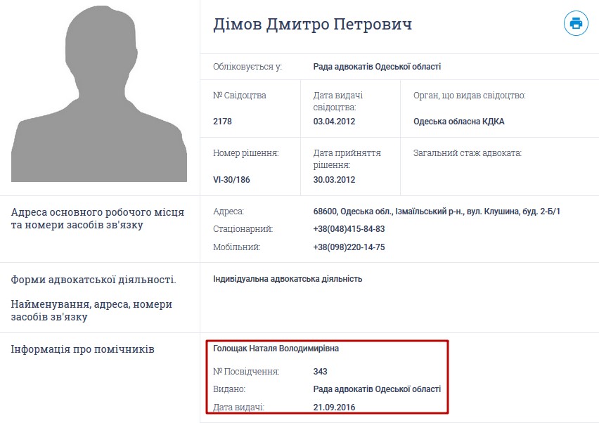 Останнім благодійником є Дмитро Петрович Дімов. Від нього дружина прокурора отримала 44 тис. грн заробітної плати та 60 тис. грн  у вигляді подарунка. Ми можемо знайти, що особа з таким же ПІБ намагалася стати суддею місцевого суду в Одеській області та зареєстрована адвокатом. І саме у цього адвоката Наталя Голощак є помічником.