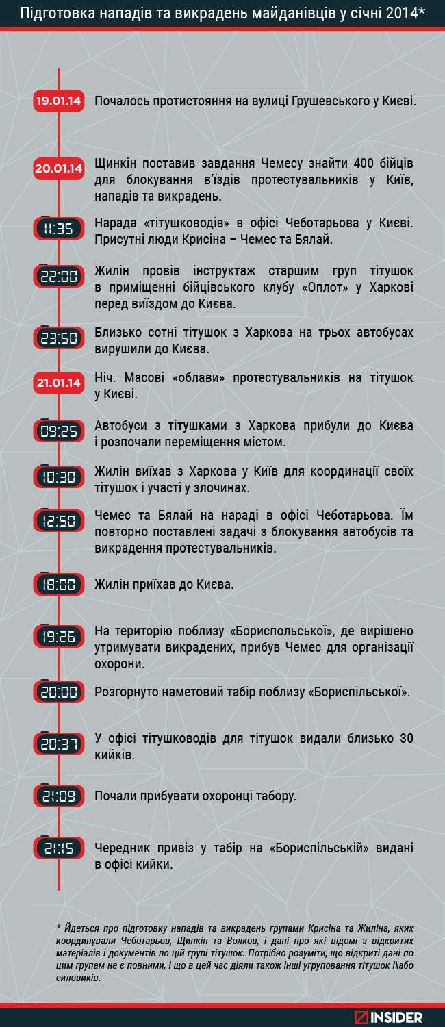 В эти же даты в офисе уголовников на тихой подольской улочке напротив окон Могилянки состоялись совещания — старшие «организаторы» уголовников вызвали «десятников» Чемеса с Бялой на ковер. Среди старших был Александр Волков, обвиняемый в организации похищении Юрия Вербицкого и Игоря Луценко. В офисе Чемес и Бяла выразили недовольство тем, что в ночь с 20 на 21 января поставленная задача по противодействию въезду протестующих в город и их похищении выполнена не было. Указания по противодействию «майдановцам» на этом совещании были продублированы.