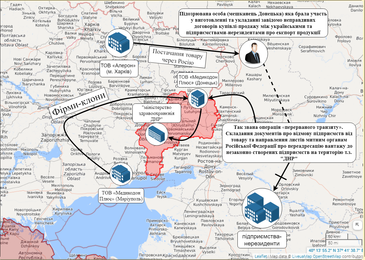 Після доставлення товарів на тимчасово окуповану територію Донецької та Луганської областей, підозрюваний здійснював реалізацію товарів за значно завищеними цінами через підконтрольні йому та іншим невстановленим особам незаконно створені підприємства, в тому числі, через підприємство ТОВ «Медикодон Плюс».