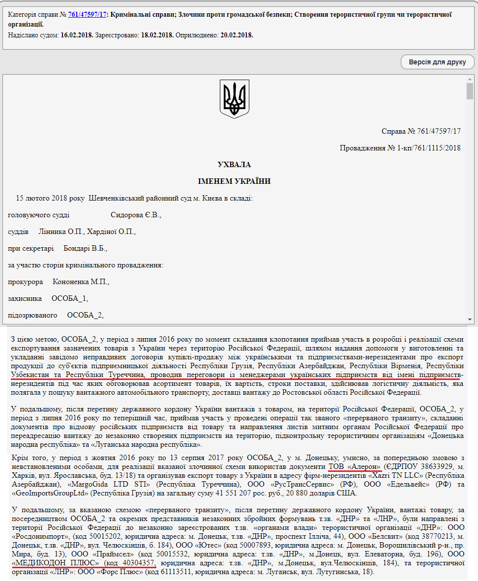 невідома особа, яка була підозрювана у справі № 761/47597/17, в період 2016-2017 років використовувала документи ТОВ «Алерон» (ЄДРПОУ 38633929, м. Харків, вул. Ярославська, буд. 13/18) для організації експорту товарів за межі України. Варто зазначити, що в судовому рішенні поряд з ТОВ «Алерон» також фігурують інші компанії, документи яких були використані для схеми “перерваного транзиту”. Однак чіткий зв’язок з ТОВ «Медикодон Плюс», яке постачає товари для т.з. “державних органів ДНР”, можна побачити лише з ТОВ «Алерон».