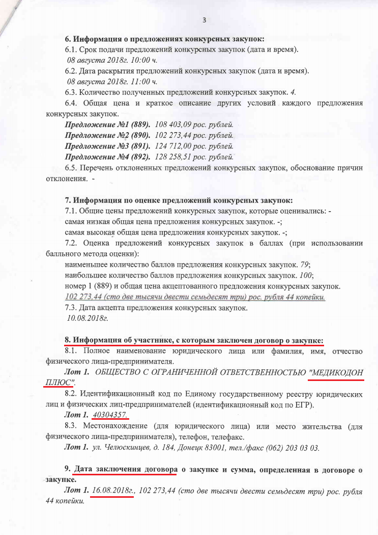 Це відомо зі “звіту про результати проведення відкритого конкурсу”, де вказана дата укладання договору з ТОВ «Медикодон Плюс» (ідентифікаційний код 40304357) на суму понад 100 тисяч рос. рублів.