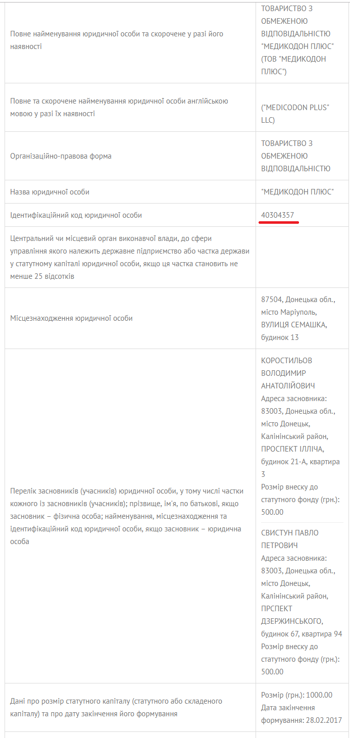 З Єдиного державного реєстру юридичних осіб України відомо, що на підконтрольній Уряду території України зареєстровано з 29.02.2016 року підприємство з ідентичною назвою - ТОВ «Медикодон Плюс», адреса: Донецька обл., м. Маріуполь, вул. Семашка, буд. 13.