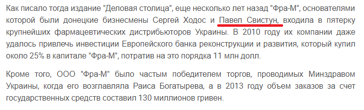 У свою чергу, відповідно до статті авторства Микити Сініцина на веб-сайті каналу «112 Україна» від 01.11.2017, підприємства, які належали Свистуну Павло Петровичу, входили в п’ятірку найбільших фармацевтичних дистриб’юторів України та активно перемагали в тендерах, які проводило керівництво Міністерством охорони здоров’я часів президентства Януковича.