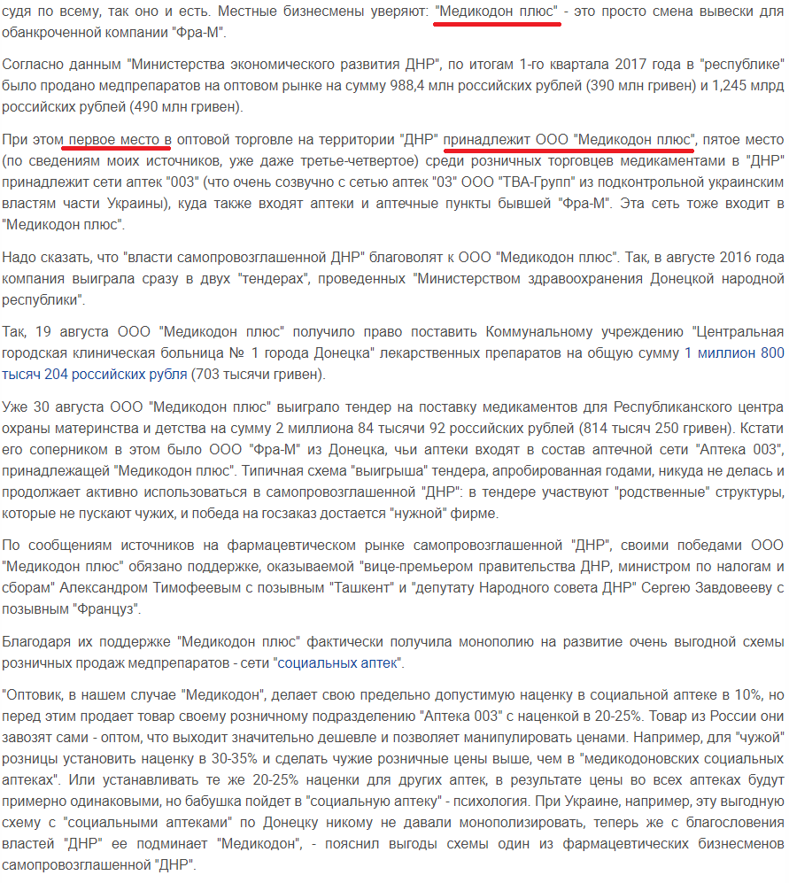 Також Микита Сініцин у своїй статті наголошує, що вже у 2016 році (після створення ТОВ «Медикодон Плюс» в Маріуполі) ТОВ «Медикодон Плюс» в Донецьку почала вигравати тендери в згаданому т.з. “міністерстві здравоохранєнія ДНР”, а також володіє широкою аптечною мережею «Аптека 003».