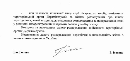 Также указано, что препарат маркирован на русском языке, что противоречит Закону Украины "О лекарственных средствах".