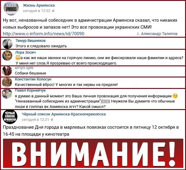 6. Жители Армянска комментируют слова оккупантов о том, что в городе все в порядке, а о катастрофе врут украинские СМИ: “Этого и следовало ожидать”, “А как же наши звонки на горячую линию, они же фиксировали наши фамилии и адреса? У меня нет слов. Я прозреваю от всего происходящего”, “Собаки бешеные”, “Качественный вброс! У многих и так нервы на пределе!”, “Празднование Дня города в марлевых повязках состоится в пятницу, 12 октября, в 16:45 на площади у кинотеатра”